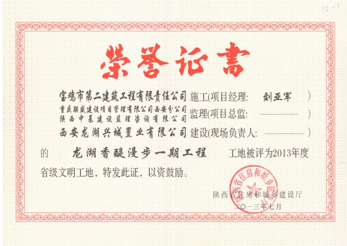 2013年省級文明工地(虢鎮(zhèn)名苑)