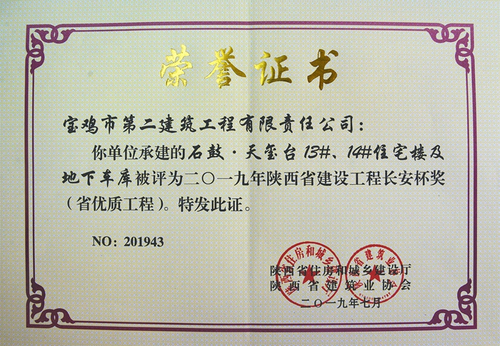 2019年陜西省建設工程長安杯獎(石鼓?天璽臺13#、14#住宅樓及地下車庫)